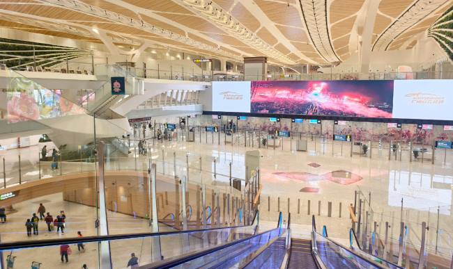 廣州機場T3國內出發(fā)安檢口上方3D大屏廣告兩塊尺寸巨大的LED屏幕構成的套裝,位于安檢通道正上方是旅客排隊、等候時 自然抬頭的視線焦點區(qū)域,形成了近乎覆蓋整個安檢區(qū)域的“視覺天幕”。兩塊總面積近800平方米的屏幕并列,形成了震撼的 雙層視覺陣列。結合3D視覺技術,能夠呈現具有縱深感和沖擊力的動態(tài)內容,在挑高空間內創(chuàng)造出小型“視覺奇觀”。