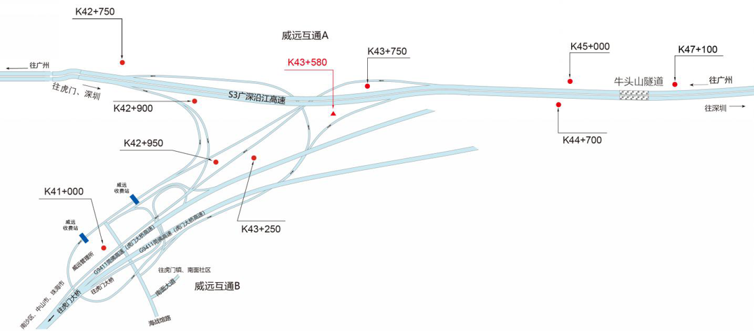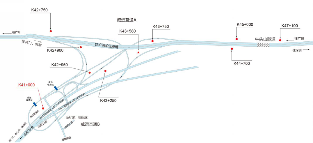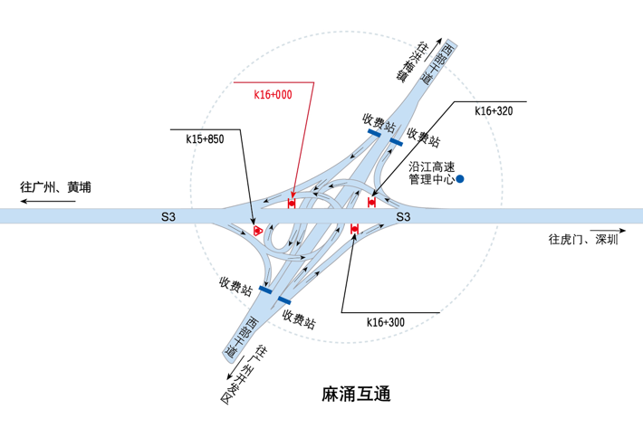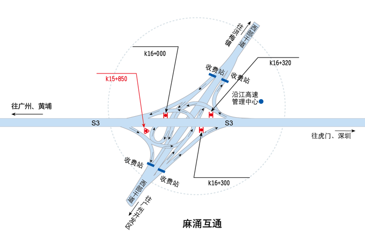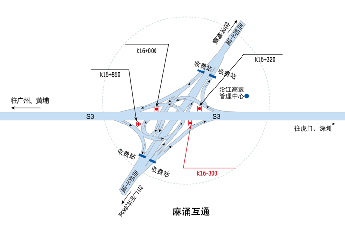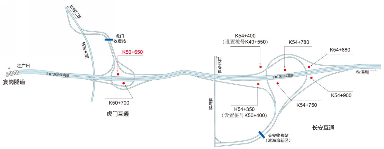 ???????廣深沿江高速公路在沿途設(shè)置12大互通:官田互通、夏港互通,南崗互通,麻涌互通(連接西部干道)、新立沙島互通、洪梅互通(連接鎮(zhèn)際聯(lián)網(wǎng)路5號(hào)路)、民田互通、沙田互通(南沙大橋互通)、虎門港互通(待建)、威遠(yuǎn)互通、虎門互通以及長(zhǎng)安互通(連接福海路、?;⒏咚傥妩c(diǎn)梅長(zhǎng)安港支線)、服務(wù)區(qū)一對(duì)(麻涌服務(wù)區(qū))。