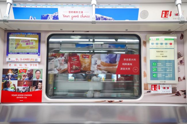 長沙地鐵品牌列車內(nèi)包車廣告的車窗貼和車窗墻貼平行于乘客視線,閱讀距離≤1米;車門和玻璃貼位于乘客上下車必經(jīng)觸點,單次閱讀時長5-8秒;車廂框架位于車窗與車門間,利用乘客移動路徑實現(xiàn)二次曝光;車廂壁貼覆蓋車廂內(nèi)壁,形成品牌信息環(huán)繞。250塊廣告位組合構(gòu)建沉浸式環(huán)境形成360°品牌空間,消除視角盲區(qū)。乘客從上車至下車全程接觸廣告,平均曝光時長 15-20分鐘/人次。