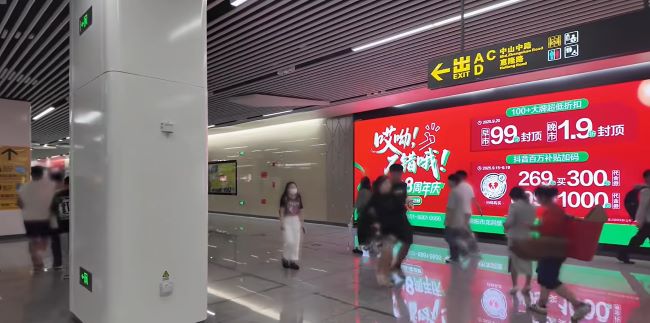貴陽地鐵花果園站LED大屏廣告23.34平方米的屏幕面積在站廳層墻面形成了顯著的視覺主權(quán)。其“頂天立地”的安裝方式充分利用了垂直空間,與乘客的視線自然契合,確保了中遠(yuǎn)距離的清晰辨識(shí)度。LED大屏的數(shù)字化形態(tài)與地鐵站現(xiàn)代化的環(huán)境融為一體,其科技感和動(dòng)態(tài)展示能力為品牌形象注入現(xiàn)代、創(chuàng)新、高端的積極聯(lián)想,特別有助于提升科技、金融、汽車等品牌的認(rèn)知價(jià)值。