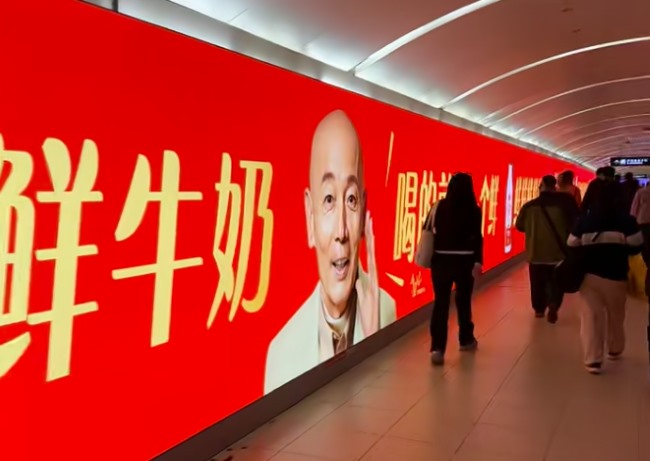 北京地鐵國(guó)貿(mào)站主題換乘通道墻面廣告整合了LED弧形屏、豪華燈箱與墻貼等多種形式,構(gòu)成了一個(gè)連續(xù)、完整的視覺(jué)展示面。這種組合將動(dòng)態(tài)屏幕的現(xiàn)代感與燈箱的靜態(tài)沖擊力相結(jié)合,豐富了廣告的呈現(xiàn)層次。通道兩側(cè)超長(zhǎng)且連貫的墻面設(shè)計(jì)形成了“頂天立地”的視覺(jué)效果,在相對(duì)封閉的通道內(nèi)對(duì)乘客形成視覺(jué)上的包圍感,增強(qiáng)了品牌的傳播氣勢(shì)。內(nèi)打光燈箱在通道環(huán)境中不僅保證了畫面色彩鮮艷、細(xì)節(jié)清晰,其自身發(fā)出的光線在略顯昏暗的環(huán)境中尤為醒目,能主動(dòng)吸引乘客視線。