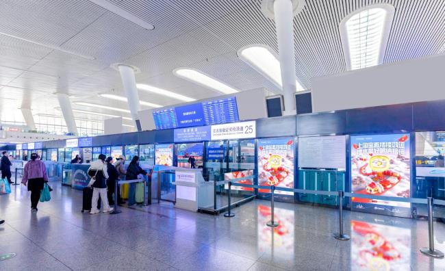 杭州東站出發(fā)層進(jìn)站安檢口LED屏廣告南北進(jìn)站口各6面屏幕形成的聯(lián)排布局,在安檢區(qū)域構(gòu)成有效的視覺覆蓋網(wǎng)絡(luò),對排隊(duì)區(qū)域的旅客形成多角度的視覺影響,增強(qiáng)了品牌形象的展示效果和統(tǒng)一性。安檢口正處于旅客進(jìn)站流程中的關(guān)鍵位置。旅客在排隊(duì)等候及通過安檢時(shí),視線會自然地落在安檢機(jī)周圍的立地豎屏上,這種位置特性確保了廣告內(nèi)容能夠直接進(jìn)入旅客的視野范圍,實(shí)現(xiàn)近距離的強(qiáng)制觸達(dá)。