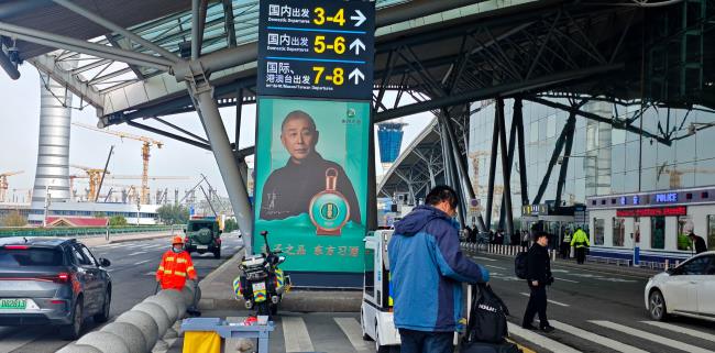 濟(jì)南機(jī)場(chǎng)航站樓戶外引橋送客平臺(tái)車道落地立牌燈箱廣告