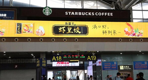 旅客們一進(jìn)檢票口就可以看到海霸王蝦皇餃廣告