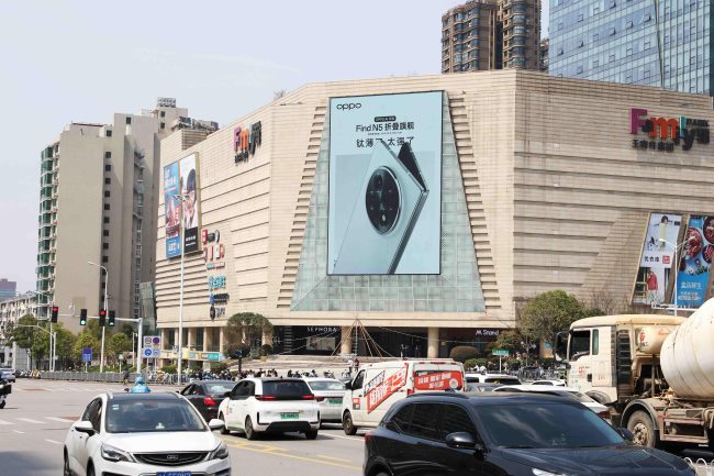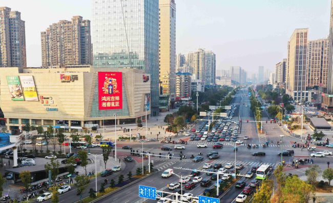長沙王府井百貨主屏LED大屏廣告地標(biāo)占位,384㎡巨幕形成河西制高點(diǎn),500米外清晰可辨,144㎡屏體輔屏近距補(bǔ)充,針對(duì)路口緩行車輛及行人。金星大道南北向車流直面主屏,桐梓坡路東西向車流及過街人流同步觸達(dá)輔屏,消除視角盲區(qū)。