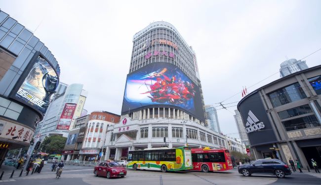 廣州北京路步行街新大新大廈外墻LED廣告大屏1196.24平方米弧形巨幕位于樓體高處形成仰視視覺壓迫感,屏體21.12米高度與建筑立面完美融合。弧形設(shè)計增強視覺縱深,150米外仍保持畫面完整辨識度,夜間播放時成為商圈視覺焦點。正對北京路與中山五路交叉口,同步覆蓋步行街人流與車行動線,弧形曲面實現(xiàn)160°視野范圍,消除直角屏視覺盲區(qū),確保各方向客流均能獲取最佳觀看視角。